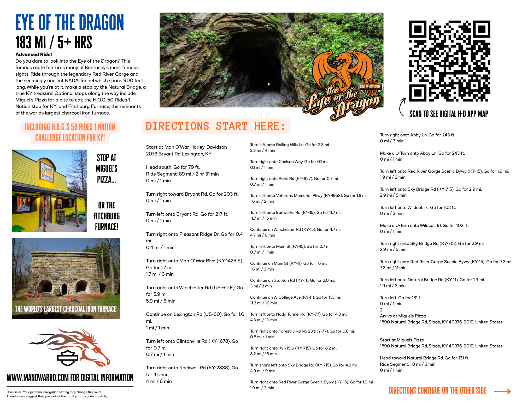 Do you dare to look into the Eye of the Dragon? This famous route features many of Kentucky’s most famous sights. Ride through the legendary Red River Gorge and the seemingly ancient NADA Tunnel which spans 900 feet long. While you're at it, make a stop by the Natural Bridge, a true KY treasure! Optional stops along the way include Miguel's Pizza for a bite to eat; the H.O.G. 50 Rides 1 Nation stop for KY; and Fitchburg Furnace, the remnants of the worlds largest charcoal iron furnace.