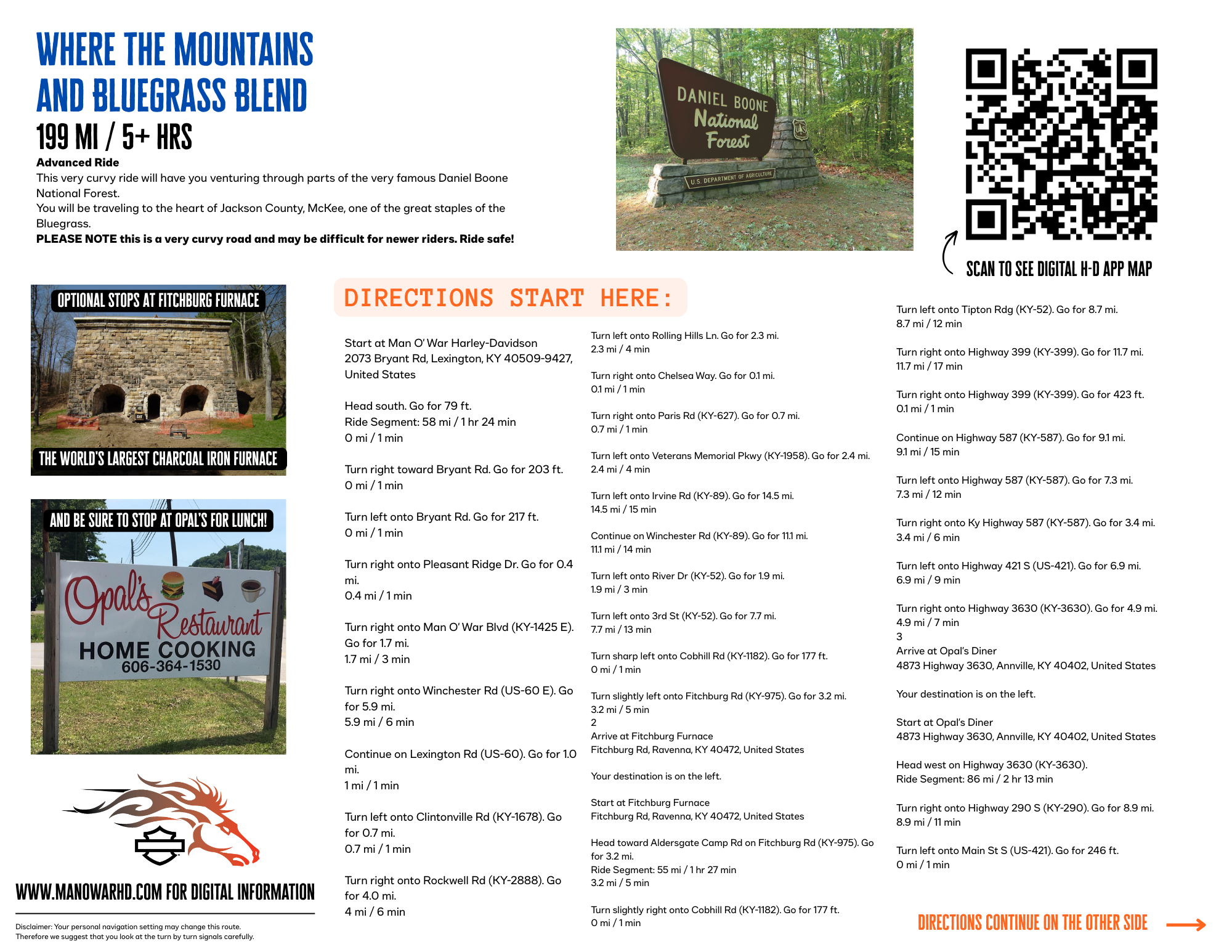 Do you dare to look into the Eye of the Dragon? This famous route features many of Kentucky’s most famous sights. Ride through the legendary Red River Gorge and the seemingly ancient NADA Tunnel which spans 900 feet long. While you're at it, make a stop by the Natural Bridge, a true KY treasure! Optional stops along the way include Miguel's Pizza for a bite to eat; the H.O.G. 50 Rides 1 Nation stop for KY; and Fitchburg Furnace, the remnants of the worlds largest charcoal iron furnace.